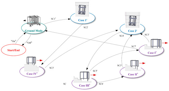 - When the SC2 is met, the state machine goes to Case 1; thus, the robot adjusts its pose. After finishing the posture adjustment, the robot’s front wheels are close to the stairs, allowing the tetrapod to land on the ground to prepare for the chassis frame stepping up on the upper stair; then, SC7 is triggered;