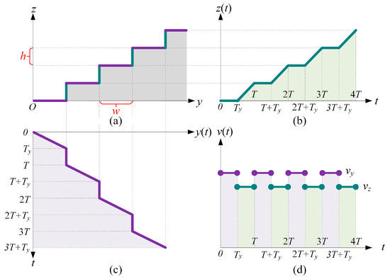 The motion during stair-climbing can be illustrated as shown in Figure 8. Since the stairs have distances in two directions, namely, the horizontal direction y and the vertical direction z, the side view of the stairs can be depicted as shown in Figure 8a. The contact point between the front wheel and the ground is the origin of the coordinate, and the stairs are assumed to be of uniform width w and height h. To better express the process of climbing stairs, the position–time plots in the horizontal and vertical directions are given, as shown in Figure 8b,c, respectively. Furthermore, the z(t)-axis of graph (b) is aligned with the z-axis of graph (a), and the y(t)-axis of graph (c) is aligned with the y-axis of graph (a) to show a clear positional relationship. Hence, with a t-axis, the change of the robot’s position on the stairs can be shown directly. Thus, the robot’s horizontal velocity vy and vertical velocity vz are constant values, as shown in Figure 8d. Then, the time to climb one stair is calculated as follows: