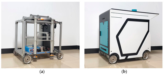A so-called home delivery is where the robot can deliver goods from the distribution center to the customers’ door. When delivering, the road becomes the first operating environment that the robot faces, the second is the staircase, and the third is an indoor one. Therefore, the robot must be able to adapt to these three environments, which must be taken into account in mechanical design. Hence, on the one hand, the robot is based on a chassis installed with four Mecanum wheels which brings great mobility; on the other hand, the horizontal movement and the vertical movement are decoupled in the robot’s design to deal with the discontinuity of stairs during stair-climbing. Based on these points, the design of the robot proposed in this paper is shown in Figure 2 and explained below.