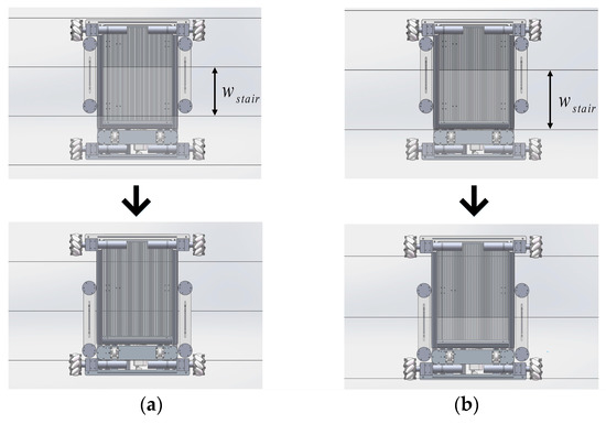 Similarly, according to Reference [30], to allow the robot to adapt to more staircases with different width, as shown in Figure 10, the robot was designed to adapt to staircases with widths between 280 mm and 340 mm. According to the analysis in Section 3, the robot’s capability of climbing the stairs with different widths depends on the two extreme cases shown in Table 6, where Δlslide is the distance of the relative slide, and it is determined to ensure the robot’s success in climbing to the upper step under the premise of the stability of the center of gravity of the robot.