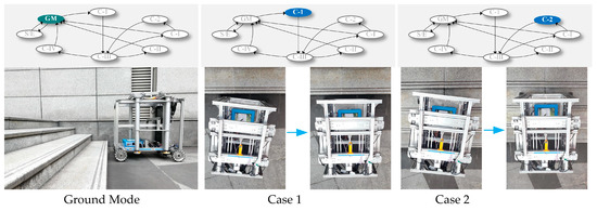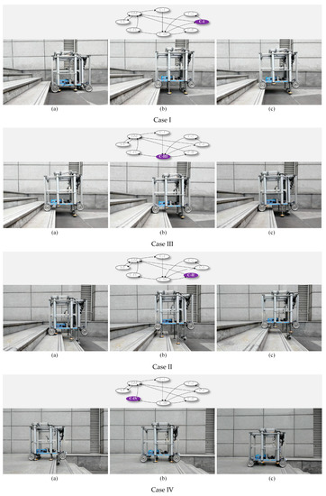 To implement the stair-climbing experiment for our robot, an outdoor staircase was chosen. Its width was 33 cm, and its height was 14 cm. The results are listed in Table 7, and the process is recorded in Figure 11. It can be seen that the robot could implement all the designed actions. It could adjust its posture if necessary (see the subfigures in which C-1 and C-2 are highlighted, where “C” denotes the abbreviation of “Case”), and it could climb up a four-step staircase successfully by choosing the four states (see the subfigures in which C-I, C-II, C-III, and C-IV are highlighted).