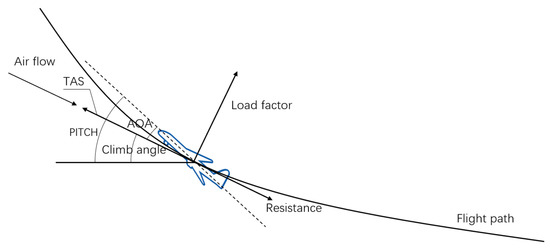 where is the pitch angle PITCH of the QAR data and is the roll angle ROLL of the QAR data. AOA (angle of attack, unit: Radians) refers to the angle between the velocity vector and the aircraft’s string, PITCH (unit: Radians) is the airplane’s pitch angle, IVV (unit: m/s) is the instantaneous hoisting rate, and TAS (unit: m/s) is the true airspeed. Figure 2 exemplifies these attitude angles geometrically.