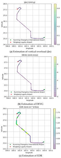 According to the estimation method described in Section 2, we achieved the vertical overload (), DEVG and EDR estimations via the Python programming language. First of all, we picked up the QAR data from a flight from Kunming Changshui International Airport to Ninglang Lake Airport on 6 October 2016. Results of the vertical overload (), DEVG and EDR estimations are as shown in Figure 3a–c. Results show that the estimated and DEVG are of similar patterns due to their linearly correlated calculations, while EDR estimations provide a very different perspective on AT risks. The former two indicators report physical bumps happening during the flight, and pointy and discrete AT events can be detected in Figure 3a,b. These results, however, could vary for a different aircraft, even under all the same atmospheric conditions outside. The EDR estimates in Figure 3c present segmented and continuous patterns, which conform with the general perceptions of atmospheric flow. Moreover, the segments of large EDR values match with the bumps presented in Figure 3a,b. All in all, EDR provides a more scientific indicator for evaluating AT risks during a flight than the former two indicators.
