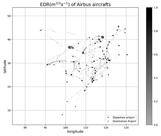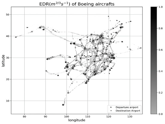 EDR provides a measurement of AT risk from outside atmospheric conditions. It is meaningful to visualize the EDR estimates from historical QAR data for exploring AT risks. We thus visualized the EDR estimates with the QAR data collected from 1 January 2016 to 31 December 2018. Note that EDR for the Airbus and Boeing aircrafts are estimated individually due different parameter settings, and we present them in Figure 4 and Figure 5, respectively. The black arrow indicates the approximate location of the departure airport and the black asterisk indicates the approximate location of the destination airport. In this study, we only utilized QAR data of the aircraft flying phrase in the air; the location of departure airports and destination airports is estimated based on the coordinates within the in-air trajectory. For each airline, the darker and bigger the point is, the greater the turbulent strength is anticipated. As seen from Figure 4, the severity of AT for Airbus aircrafts in the northwest region and areas around Beijing is apparently higher than in other areas. In Figure 5, the occurrence of AT for Boeing aircrafts in the southeastern coastal areas is more frequent than in the other areas, and the severity of AT is slightly higher than in other areas. The results provide a good overview on the spatial patterns of AT intensities; particularly, clusters appearing in both Figure 4 and Figure 5 may indicate areas of high AT risks. These hotspots could be related to potential factors for further analysis, for example meteorological, environmental, and terrain factors. This forms a good topic for future studies, particularly fundamental for early-warning studies. Moreover, note that these EDR results are calculated with QAR data collected within three years. The temporal dimension could be incorporated to explore their spatio-temporal patterns, which could provide richer information for specific applications, like flight route planning.