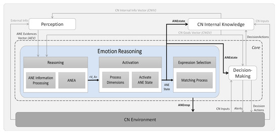 The emotion reasoning element is one of the core components of the ANE model, which comprises three other components as well: the Reasoning, the Activation, and the Expression Selection, as illustrated in Figure 6.