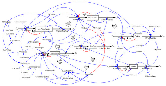 As it can be identified in the causal loop diagram of Figure 7, the main causal loops for the ANEA causal model are: collective commitment reinforcing loop (COCOM-R); financial performance reinforcing loop (FINPE-R); innovation reinforcing loop (INNOV-R); community reinforcing loop (COM-R); knowledge generation reinforcing loop (KNOW-R); valence reinforcement loop (VALEN-R); and arousal balancing loop (AROUS-B). A detailed description of each identified causal loop is presented below (Table 8):