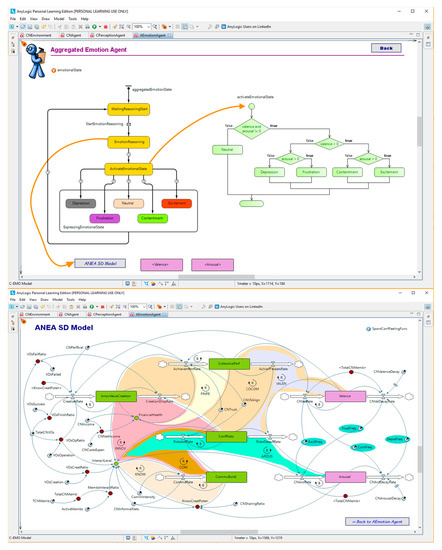 It is the aggregated network emotion appraisal (ANEA) element of the reasoning component that is in charge of estimating the values of the <V, A> dimensions; in the same vein as the previous one, a system dynamics modeling approach is designed for this element—the ANEA SD Model.