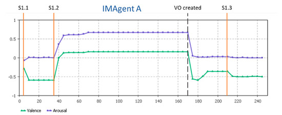 At the beginning of the simulation run, which corresponds to the S1.1, the value of the tuple (valence, arousal) corresponds to frustration, as expected. This agent represents a company that has joined the CN a few days ago, so its metrics are still below average. Nonetheless, following Scenario S1.2, it receives an invitation to form a VO and, as can be seen in t = ~35, both valence and arousal increase substantially (activating the excitement IME), denoting both the satisfaction and the stimulus that this event provoked in company A. Then, for a considerable period of days, its IME state remains stable. After a couple of months, the VO is finally created, and is reflected in the results with the decrease in valence and arousal at t = 170, activating the frustration IME. Meanwhile, some metrics are updated, such as the number of VOs or the CN income, shown in the increase in valence in t = 180. However, company A is still frustrated; it is still a young company in the CN and its goals are not yet met. Finally, the occurrence of a CN trust breach (S1.5) at t = 210, conducts the IMAgent A state to depression, as expected.