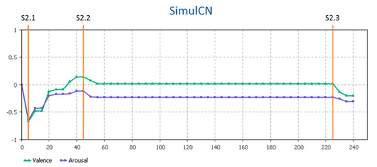 Initially, with the simulation run of the initial conditions (S2.1), it can be seen that both valence and arousal took a period of time before reaching the contentment ANE state (as expected) around t = 35. This unstable period has to do with the initial dynamics of the involved members. When Scenario S2.2 is put in practice, i.e., when the only VO under creation fails and the levels of trust and values alignment of the VO decrease substantially, both valence and arousal decrease and the ANE remains in the contentment state, although with a reduced value of valence (it can suddenly change to depression, which is what was expected). After a period of days, changes in member’s IME affects the dynamics of the ANE, as simulated with the S2.3. What happens is a shift from contentment to depression states in two members, which is translated into a negative reaction of both valence and arousal, conducting the ANE state in SimulCN to depression.