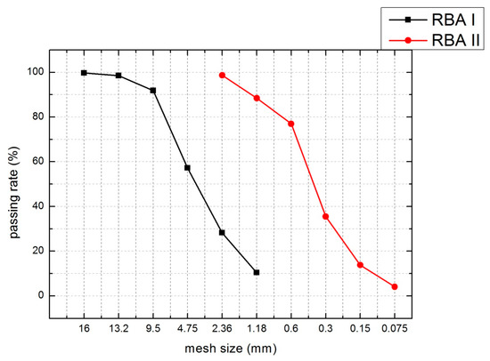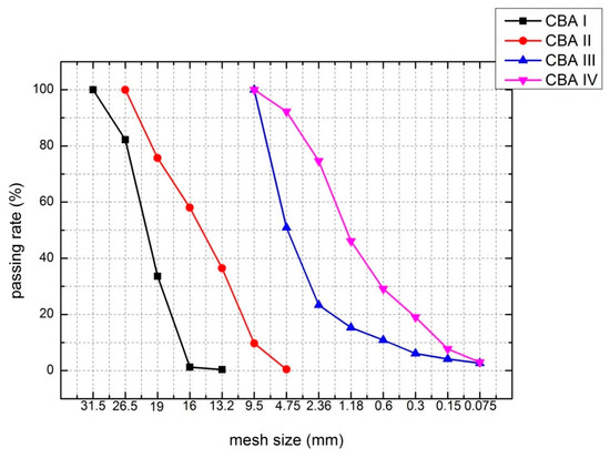 Crushed basalt aggregate (CBA) produced from Tumen mountain, Jilin province in China, was crushed into four grades: CBA I (20–30 mm), CBA II (10–20 mm), CBA III (5–10 mm), and CBA IV (0–5 mm). The four grades of CBA will be screened into a single particle size, and the cement stabilized macadam test gradation is formed by a mix proportion design. RBA is taken from the demolition of the shanty renovation building in China, Jilin Province. It is crushed into two grades: RBA I (0–20 mm) and RBA II (0–5 mm). All these grades were applied to the experiment after sieving and then dispensed experiment gradation. The sieving results are shown in Figure 1 and Figure 2.