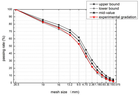 The experimental gradation of cement stabilized macadam was designed [20], which satisfies the gradation range stipulated in the Technology Guidelines for the Construction of Highway Roadbases (JTG/T F20—2015) and is close to the lower bound. The experimental gradation curve is shown in Figure 3.