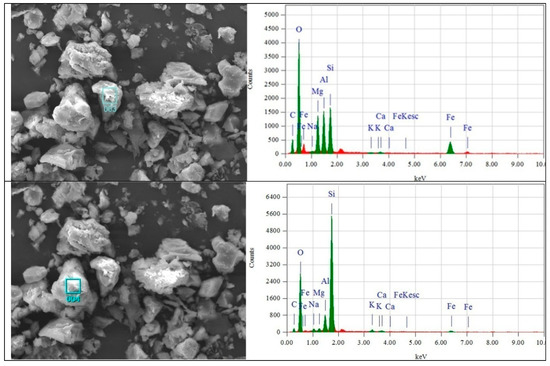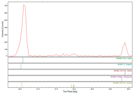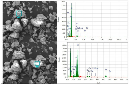 Construction waste clay brick powder was scanned by the above two micro detection methods; Figure 4 and Figure 5 were obtained as scanning results. Figure 4 illustrates four points of the SEM scanning result, which showed that there are several major elements in construction waste clay brick such as O, Si, and C, with a relatively large mass percentage of each as shown in Table 2. Among the other elements, Al is the most abundant, and Ca, Fe, Mg, and Na all exist in a small mass percentage. In these scanning pictures, 1500x magnification was used to observe the details. Figure 5 is the XRD scanning result, which shows that quartz (SiO2), calcite (CaCO3), chalcopyrite (CuFeS2), kyanite (Al2SiO5), and the residual graphite (C) from the process of firing are contained as the main crystalline compositions in construction waste clay brick.