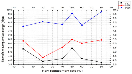 The unconfined compressive strength of 7 d is the only hard and fast rule regarding the design of cement stabilized macadam(JTG/T F20—2015). Specimens were used with curing ages of 7 days, 28 days, and 90 days, respectively, and the values of specimens with replacement amounts of RBA of 0%, 20%, 40%, 50%, 60%, and 80% are shown in Table 5.