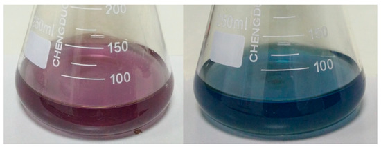 In the comparison test, the solution with Cal-Red was purple at first and turned blue after 0.40 mL of EDTA-2Na standard solution was consumed. This change (in Figure 7) proved that clay brick contains soluble calcium and can be dissolved in a solution environment after cement hydration. The titration results of specimens prepared in different replace proportions are shown in Table 6.