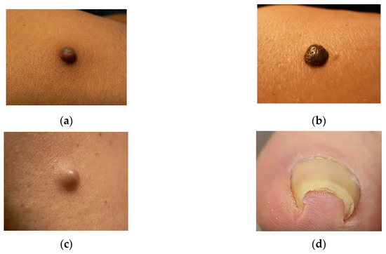 Images of the most common lesions in the minor surgery practice: dermal nevus (a); seborrheic keratosis (b); epidermal cyst (c); ingrown toenail (d).