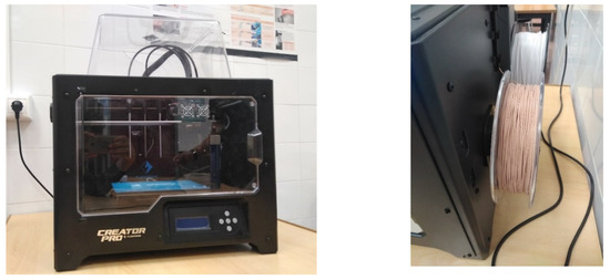 There are several 3D printing techniques [3]: stereolithography (SLA), polyjet (PJ), selective laser sintering (SLS), and binder jetting (BJ). However, the most commonly used technique today is the fused deposition modeling (FDM) technique [4,5,6,7]. This technique has several advantages [8]: machines and filaments have low costs; it is easy to find information on the internet about this technique; the learning curve is short; and there is a large catalog of filaments available on the market, with multiple qualities and applications [9].