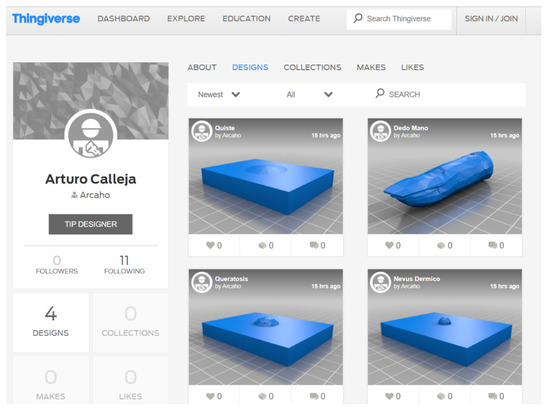 User web page created in Thingiverse to upload the models of minor surgery injuries. Any interested user can download these standard tessellation (STL) models for free and print them in their home or primary care center.