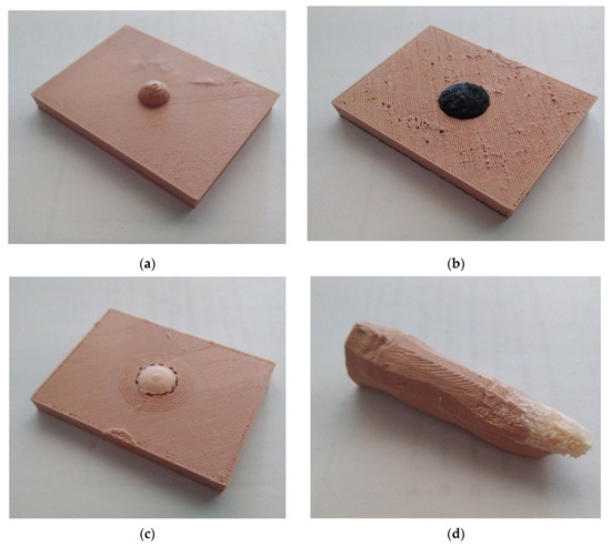 In minor surgery courses, the different phases of an intervention are taught [25]: (i) infiltration of anesthesia at the local level, (ii) removal of the lesion, and (iii) closure of the surgical wound. There are training models on the market that allow some of these phases to be practiced; however, these models have several handicaps: they do not have all the typical lesions in minor surgery, they do not faithfully reproduce the lesions of minor surgery, and they have a high cost. For these reasons, courses traditionally use pig’s feet, chicken thighs or bacon to practice the removal of figured lesions and suturing of wounds.