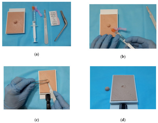Stages of the intervention performed on the dermal nevus model: preparation of the necessary material (a); infiltration of the anesthesia (b); removal of the lesion (c); outcome (d).