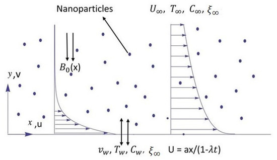 The unsteady two-dimensional MHD flow of an incompressible fluid and Casson nano-fluid viscous flow over an electrically conducted stretching/shrinking sheet in the presence of heat source was considered. We choose an xy-ordinate system as the measurement of the sheet will be taken with x-, y-axis, and the y-axis along the vertical direction of the sheet, as given in Figure 1. The sheet is moving with non-uniform velocity since a is the stretching rate along the x-axis but is positively constant, as by property . The transverse magnetic field is supposed be the function of distance from the origin and is defined as with , where is the strength of the magnetic field. The induced magnetic field is negligible as compared to the applied magnetic field. The free stream temperature is supposed to be , the free mass concentration is , and the nano-particle concentration is . The governing equations for flow can be put into the form as in ([25,26])
