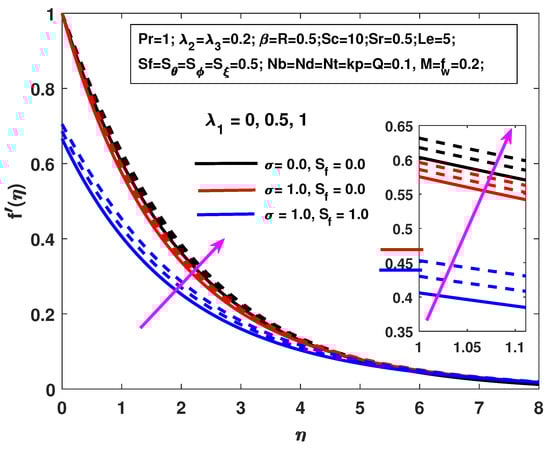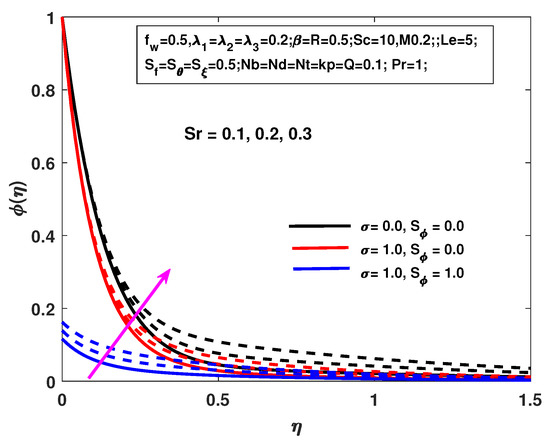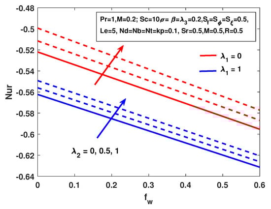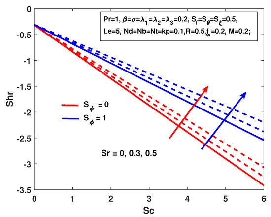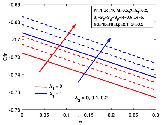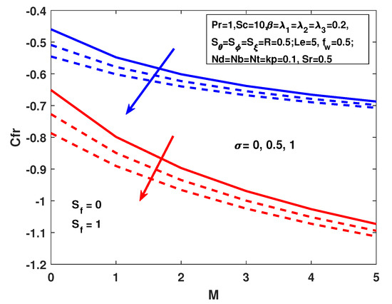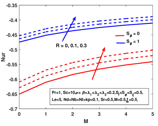when Equation (7) is substitited into Equations (17)–(19), the final dimensionless form is obtained; , , where the local Reynolds number is , reduced skin friction is , reduced Nusselt number is , and the reduced Sherwood number is .