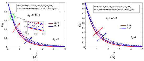 Figure 3 and Figure 4 exemplify that the velocity boundary layer thickness increases with enhancing the thermal buoyancy parameter and the nano-particles concentration buoyancy parameter in the non-existence of hydro-dynamic slip and the existence of hydro-dynamic slip. In these two cases, we have to perceive that the momentum boundary layer is prolonged with the increasing values of buoyancy and . Also in Figure 3 and Figure 4, the velocity profile is increasing in the case of steady and unsteady flow and alike behavior of solutal buoyancy has been observed in Figure 5. It is observed that increasing the value of radiation parameter R is the reason to improve the velocity profile and incentive of instability in parameter , and the velocity profile is explained in Figure 6.