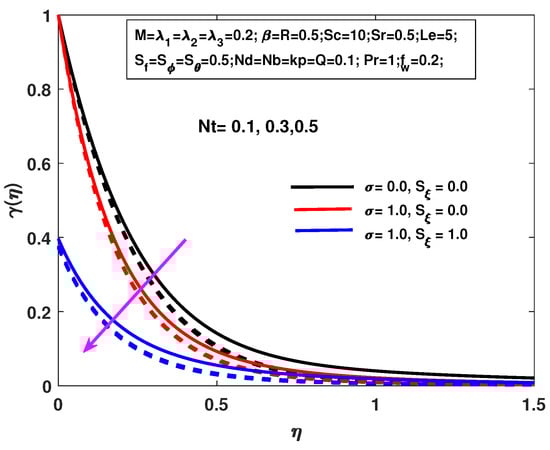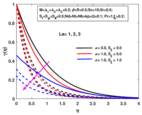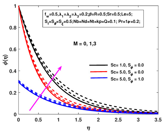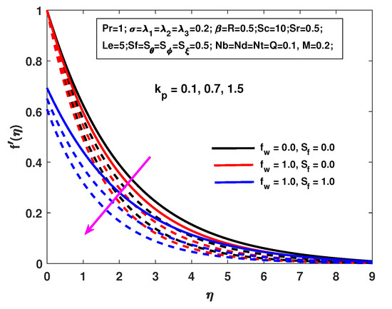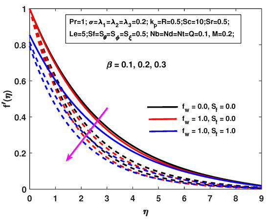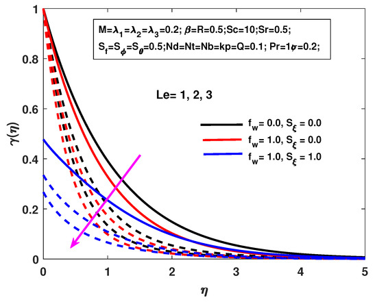 Figure 14 indicates the impact of on the nano-particle volume fraction profile without the existence of nano-particles concentration slip and with the existence of nano-particles concentration slip. It is clear from the figure that in both the steady and unsteady cases, increasing values of cause a decline in the nano-particle volume fraction profile. The impacts of and over the nano-particle volume fraction profile have been illustrated in Figure 14. It is noticed that the nano-particle volume fraction profile decreases in increments in the values of and . Figure 15 and Figure 16 show the impact of Lewis number , unsteadiness parameter , and suction parameter on the nano-particle volume fraction profile, and interpretations about the nano-particle volume fraction profile are made. It is seen that increasing values of and in the boundary layer of nano-particles causes the volume fraction profile to decline. In addition, it is clear from the figures that the nano-particle volume fraction profile decreases both with and without the existence of nano-particles concentration slip.