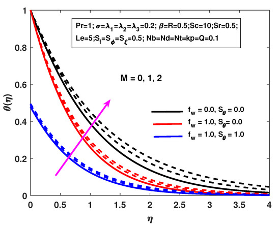 Figure 10 demonstrates the influence of and on the temperature profile with and without the existence of thermal slip, with increasing , , and causing the thermal boundary layer to decrease. The description of the effect of , , and with the temperature profile is explained in Figure 11. It is clear that with the increase in , the thermal boundary layer of fluid flow increases in both cases. It can also be perceived that decreases the thermal boundary layer thickness in both cases. In Figure 12, there is the influence of M and on the solutal profile with the non-existence of solutal slip and with the existence of solutal slip. From the figure, it is clear that with the increasing value of M, the solutal profile also increases in both cases. Furthermore, the effect of over the solutal profile declines the profile. The impact of the existence and non-existence of solutal slip and increasing values of is depicted in Figure 13. It is seen that increasing the value of the Soret parameter increases the solutal profile in both the steady and unsteady cases. It is also seen that increasing the value of the slip results in decreasing the thickness of the solutal profile boundary.
