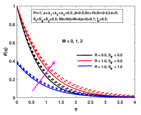 Also, we perceive in both cases that as the permeability of increases, this causes a decline in the velocity profile with no hydro-dynamic slip and with hydro-dynamic slip. Furthermore, we also perceive in Figure 6 that the suction decreases the momentum boundary layer thickness. Similar behavior of the Deborah number has been perceived on the velocity profile in Figure 7. Figure 8 indicates the impact of M on the temperature profile with the non-existence of thermal slip and with existence thermal slip. In the figure, it is clear that with an increasing value of M the temperature profile also increases in both cases. From Figure 8 it is also clear that suction decreases the thermal boundary layer thickness in both cases and the thickness of the thermal boundary layer can be controlled with the help of suction . Figure 9 depicts the similar behavior of M. It is perceived that the temperature increases with the discrepancy in parameter R.