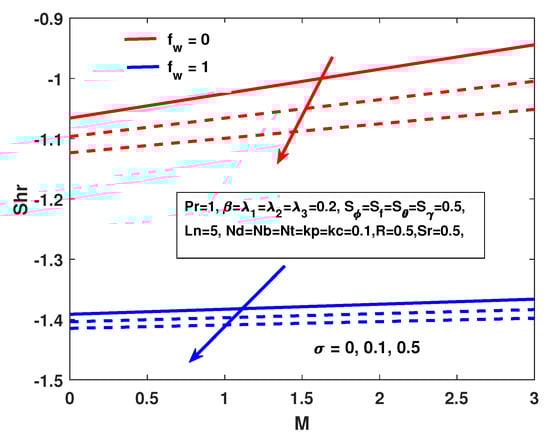Figure 17 shows the impact of M, , and on the skin friction co-efficient and also shows that the skin friction co-efficient decreases with the increase of slip parameter, magnetic and unsteadiness parameter. In Figure 18, the skin friction coefficient increases with the increment in the thermal buoyancy, suction parameters, and solutal buoyancy. Figure 19 represents the increment in the value of Nusselt number with increasing values of magnetic, radiation and thermal slip parameters. As perceive in Figure 20 that when the values of solutal buoyancy and suction intensity increases with the existence and the non-existence absence of thermal buoyancy. Figure 21 demonstrates that the impact of , , and on the reduced Sherwood number. Also from the Figure 22, it clear that the reduced Sherwood number decreases with increment in the values of the unsteadiness parameter , magnetic parameter M and the suction parameters .