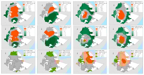 Figure 3 shows the spatial distribution of the correlation coefficients between crop yield deviation and population redistribution in Mexico. The first, second, and third rows show the distributions of the correlation coefficients of MeanYield with no control variable (Model 1), Built-up as a control variable (Model 2), and Pop as a control variable (Model 3), respectively. The first and second columns present the coefficient distributions of MeanYield calculated using the LPJmL_Gswp3 and LPJmL_Princeton model data, respectively, for 1990–2000, and the third and fourth columns present the corresponding distributions for 2000–2010. Figure 4 shows the spatial distribution of the coefficients of the correlation between crop yield deviation and population redistribution in Ethiopia, which is consistent with Figure 3.