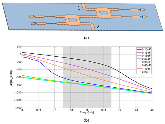 The phase shift provided by a loaded coupler is not enough to guarantee a phase variation higher than 360°. Therefore, in the complete device, two cascaded sets are connected. Figure 5 provides the complete phase shifter model, together with its performance results. The desired band in the design is at least of 1.5 GHz, centered at 18 GHz.