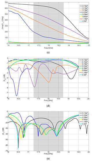 Simulation results of the 18 GHz phase shifter, (a) design; (b) arg(S21); (c) Δarg(S21) (related to min arg(S21) value, 2.2 pF); (d) |S21|; (e) |S11|.