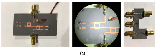 The high operating frequency band (central frequency 18 GHz) is highly demanding and limiting in terms of design and manufacturing. In our work, best efforts are concentrated in having an easy-manufacturing device with reasonable performance results. Thus, the device is based on planar microstrip technology, which is almost in its frequency limit of operation. All the manufacturing and mounting has been carried out in our laboratory. The photolithography manufacturing process introduces a manufacturing size uncertainty of around 100 microns. The substrate is a Neltec N9217 (0.508 mm thickness, relative permittivity of 2.17, and <0.0008 loss tangent). The lumped elements (the MA46585 varactors) are welded by means of conductive epoxy. The device circuit design dimensions are provided in Table 1.