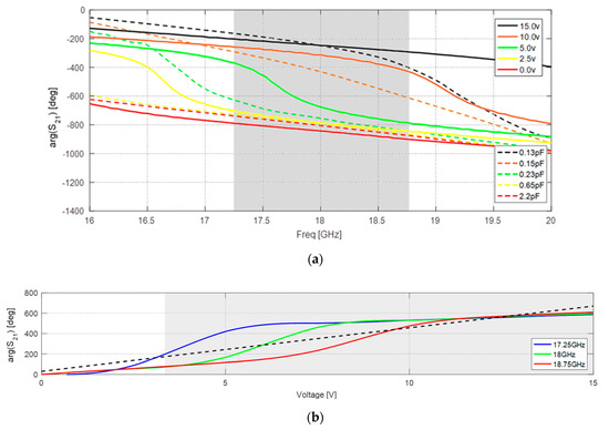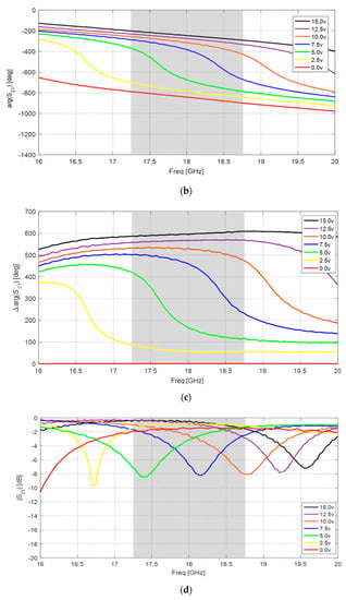 Notice that the simulation results in Figure 7a are in terms of capacitance and the experimental ones are in terms of voltage. It must be noticed that there is a non-negligible difference between pairs of simulation and experimental curves. However, the phase range of variation is preserved and the phase shifter prototype is fully functional, only needing a voltage/phase conversion table. In addition, it must be pointed out that, although the phase/capacitance relation is not linear, it is compensated by additional non-linear behavior of the capacitance/voltage relation. It is worth mentioning that, although the device provides a quasi linear phase/voltage response at the central frequency, this linearity is strongly degraded at the band limits, as it can be seen in Figure 7b. However, since the prototype provides a complete phase shift of around 600°, part of this possible variation can be sacrificed in order to increase the linearity of the device, as detailed in Figure 7b, where the grey region is the one that provides at least 360° phase variation.