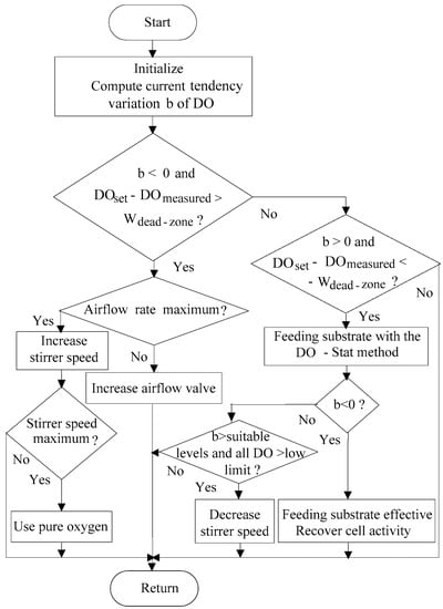 During the initial growth phase, as the oxygen demand increased due to the gradual increase in biomass concentration, the DO rapidly decreased. The following parameters were assumed: DO tendency variation is b, the DO set point is DOset, the DO measured value is DOmeasured, and the dead zone width of the actuator is Wdead-zone, also known as dead band, the region of insensitivity of a actuator. If b < 0 and DOset − DOmeasured > Wdead-zone, the DO concentration was monitored with a DO probe and maintained at a set point by increasing the airflow rate and, subsequently, the stirrer speed. The DO control and fermentation data recording interval for DO-Stat (‘traditional’ or improved) was set to 1 min. Once the substrate was depleted, the DO level began to rise; if b > 0 and DOset − DOmeasured < −Wdead-zone, substrate was fed to the fermentor via a peristaltic pump controlled using a DO-Stat (‘traditional’ or improved) method. The DO level decreased once again as recoverable cell metabolism, and biosynthesis of the fermentation product increased after the substrate was supplied. Figure 1 illustrates the algorithm used as part of the DO tendency control strategy [21].