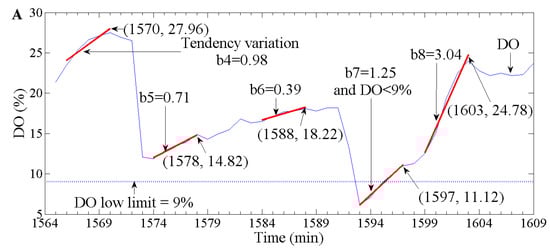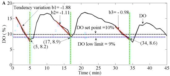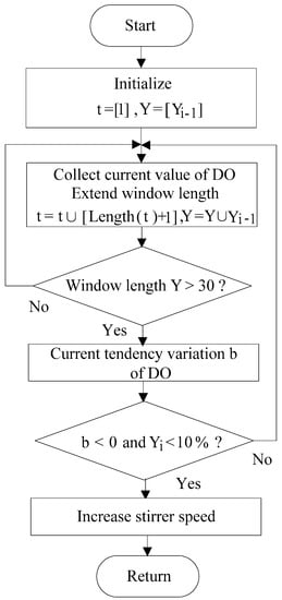 As the fermentation process continued, the characteristics of the biochemical dynamics changed significantly over time; moving window (MW) technology was used to track the variation tendency of the DO. It was necessary to add the newest data and discard the old data as the DO level changed; in fact, the selection of the window length was one of the most challenging aspects of DO control. Sufficient information could be included to determine the actual trend in the change of DO levels by setting an appropriate window size; a suitable window length ensured that the sampling data reflected the process dynamics. If the window size was too large, the automated control of DO lagged. If window size is too small, the DO variation trend was disturbed by noise in the data caused by the fermentation process. Subsequently, the data window was updated by inserting the current data point and dropping the oldest value, which enabled the DO control algorithm to adapt to variations in the fermentation process [22,23,24]. For different fermentation processes, the window size was set to different values, which were determined by trial-and-error.