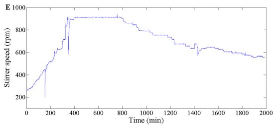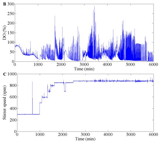 As can be seen from Figure 4, DO concentration started decreasing after about 2–3 h of fermentation and reached close to zero during the cell growth phase. The fall of DO in fermentation broths was due to the high demand for substrate utilization during the exponential phase of the organism, and the subsequent increase was due to lower demand. The gradual increase in the stirrer speed to a maximum (up to around 900 rpm) at about 400 min reflected this characteristic. Additionally, the agitation speed was chosen to render a proper mixing while avoiding excessive shear forces that may have caused cell rupture [26]. After crossing the maximum, the stirrer speed gradually decreased to about 550 rpm at 32 h, in the latter part of the fermentation process. Furthermore, as Figure 4D shows, two DO values were very high, this is because the substrate was depleted and the DO concentration began to rise sharply. DO in the broth was the result of a balance of its consumption rate in the cells and the rate of oxygen transfer from the gas to the liquid phase.