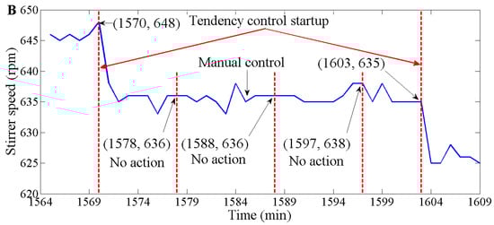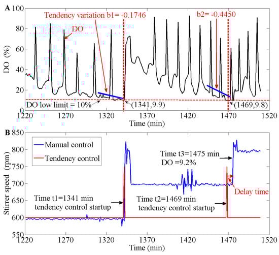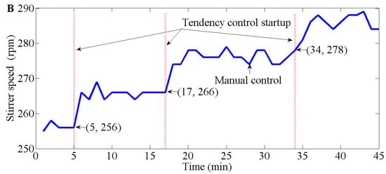 As indicated in Figure 8B, the stirrer speed was increased from 600 rpm at 1220 min to approximately 800 rpm at 1509 min. As shown in Figure 8A, the range in the DO level was greater (10–95%). The actuator was also frequently under action during manual control of DO; in contrast, the actuator was much less active when the tendency control method was used. From 1220 to 1509 min, the actuator only acted two times. Although the actual values of DO were 9.9% at 1341 min and 9.8% at 1469 min, both of which were below the DO low limit of 10%, the average DO value was greater than 10%. Moreover, at 1469 min, the manual control failed to detect when the DO level fell below 10%, which produced a time delay of 6 min; during the DO tendency control experiments, all processes were initialized in a timely fashion. More importantly, the stirrer speed remained at an almost constant level after experiencing a sharp peak at approximately 1341–1348 min. For the aforementioned reasons, the automatic control of DO is necessary to conduct a fermentation process efficiently, and can lead to improved process reliability as well as reduced manpower input.