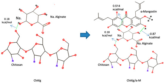 In silico studies of chitosan (Ch), alginate (Alg), and α-Mangostin (α-M). Discovery studio visualizer and AutoDock 1.6 applications were applied for molecular docking studies.