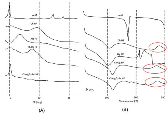 Characterization of ChAlg/α-M HF. (A) XRD patterns; (B) DSC thermographs. The experiments were performed three times, and representative data are shown.