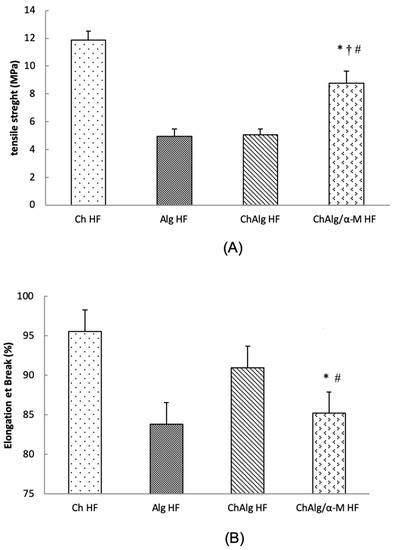 Mechanical properties of ChAlg/α-M HF. (A) Tensile strength; (B) elongation at break. Each value represents the mean ± SEM of three experiments. * p < 0.05, compared to the Ch HF. † p < 0.05, compared to the Alg HF. # p < 0.05, compared to the ChAlg HF.