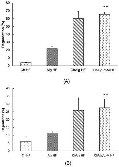 Degradability study of ChAlg/α-M HF. (A) Trypsin; (B) TCA (trichloroacetic acid). Each value represents the mean ± SEM of three experiments. * p < 0.05, compared to the Ch HF. † p < 0.05, compared to the Alg HF.