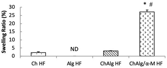 Swelling ratio of ChAlg/α-M HF. Each value represents the mean ± SEM of three experiments. * p < 0.05, compared to the Ch HF. # p < 0.05, compared to the ChAlg HF.