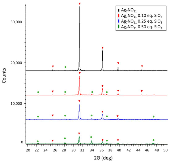 Powder X-ray diffraction of Ag7NO11:SiO2 (0.0:1 to 0.5:1 molar equivalents SiO2:Ag). Solid-state silver compounds were identified as silver oxynitrate (Ag7NO11, inverted red triangles) and silver sulfate (Ag2SO4, green circles).