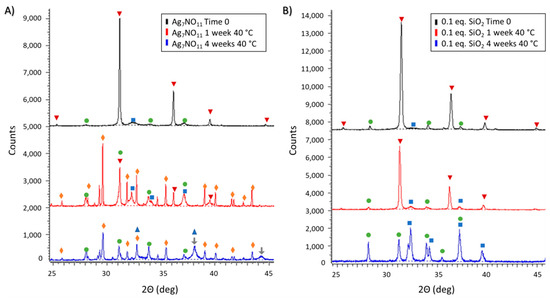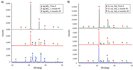 Powder X-ray diffraction patterns of (A) silver oxynitrate (Ag7NO11) and; (B) Ag7NO11:SiO2 containing 0.10:1, SiO2:Ag, equivalents silica over a four month period under storage at ambient room temperature (RT) conditions. Solid-state silver compounds were identified as silver oxynitrate (Ag7NO11, inverted red triangles), silver sulfate (Ag2SO4, green circles), and argentic oxide (AgO, blue squares).