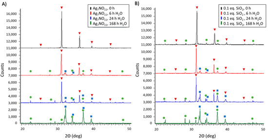 Powder X-ray diffraction patterns of (A) silver oxynitrate (Ag7NO11) and; (B) Ag7NO11:SiO2 containing 0.10:1, SiO2:Ag, equivalents silica over a seven-day period in an aqueous solution at room temperature. Solid-state silver compounds were identified as silver oxynitrate (Ag7NO11, inverted red triangles), silver sulfate (Ag2SO4, green circles), and argentic oxide (AgO, blue squares).