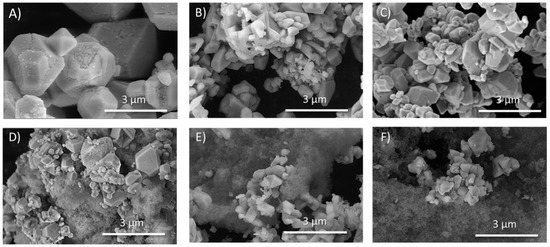 Scanning electron microscopy images of silver oxynitrate and Ag7NO11:SiO2 containing 0.1:1, SiO2:Ag, exposed to aqueous media for a period of seven days. Silver oxynitrate (Ag7NO11) (A) prior to aqueous exposure; (B) after 24 h of exposure to aqueous media; and (C) after 168 h of exposure to aqueous media. Ag7NO11:SiO2 containing 0.1:1, SiO2:Ag (D) prior to aqueous exposure; (E) after 24 h of exposure to aqueous media; and (F) after 168 h of exposure to aqueous media.
