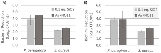 Single time point log reduction of Gram-positive S. aureus (4 h) and Gram-negative P. aeruginosa (1 h) were evaluated in Mueller Hinton Broth (MHB) inoculated to a concentration of 1 × 106 CFU/mL. The efficacy of silver oxynitrate and Ag7NO11:SiO2 containing 0.1:1 SiO2:Ag were evaluated at normalized silver concentration. Following treatment, the remaining bacteria were numerated and log reduction quantified versus untreated control. The efficacy of Ag7NO11:SiO2 was compared with silver oxynitrate and was found to be equivalent for both organisms tested (p value > 0.05), as shown in Figure 8A.