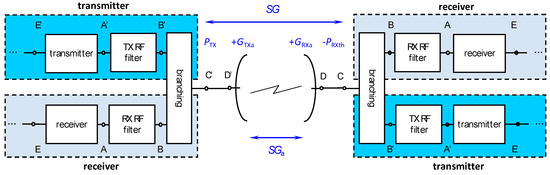 | Frequency Band (GHz) | Nominal PTX (dBm) | Gant □ 20 cm (dBi) | Gant ø 30 cm (dBi) | PRXth at BER = 10−6 (dBm) | SGa = SG + 2Gant | |